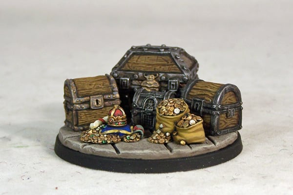 【商品仕様】メタルミニチュア計6個入り(4個の宝箱、王冠と金貨、宝物袋)