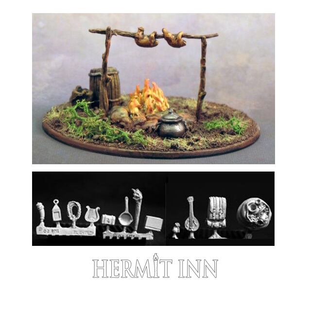 【商品仕様】メタルミニチュア/野営グッズの詰め合わせ:調理道具、楽器、食器、キャンプファイア、掘削道具などの楽しいセット。内容物は白黒画像をご覧ください。野営シーンの演出やベースデコレート、ジオラマなどに!