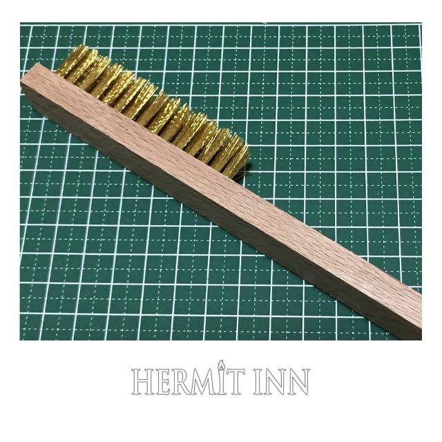 メタルミニチュア組み立て時の磨き上げに最適な毛足、列数、幅、柄の長さ、バランスを備えた、メタルミニチュア磨きに理想的な最高級真鍮ブラシ。ハーミットインのオーナー、籾山庸爾自身愛用品と同一のブラシです。