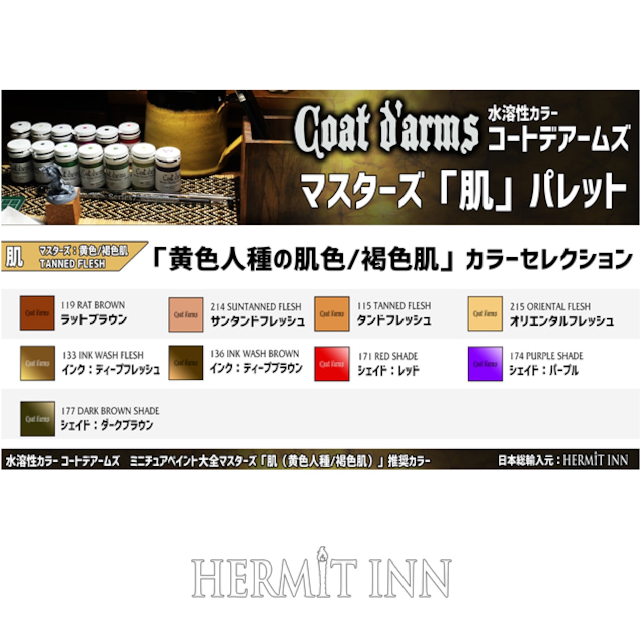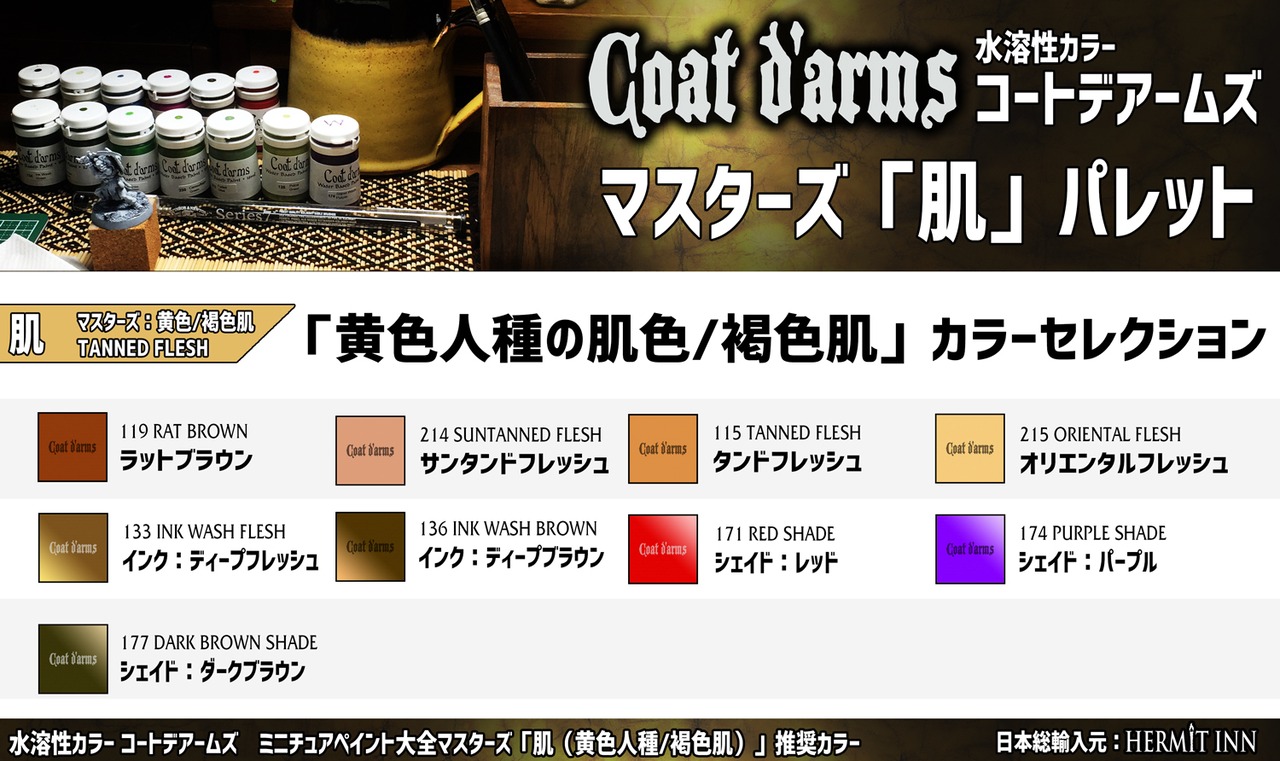 ハーミットイン図書室(note)内ホビーマガジン記事「ミニチュアペイント大全マスターズ:肌」で使用されたコートデアームズ9色のセット。黄色人種や褐色肌をペイントする上での決定版コンビネーションを、イッキに揃えられます。